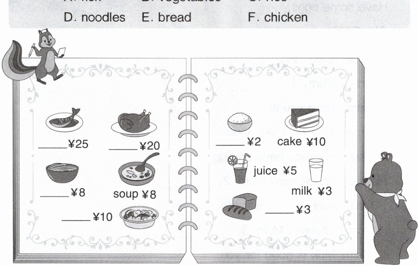 1. noodles × 2,fish ¥______