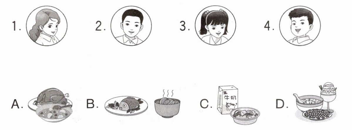 三 Harry 正在统计同学们午餐想吃什么。读对话,连一连。