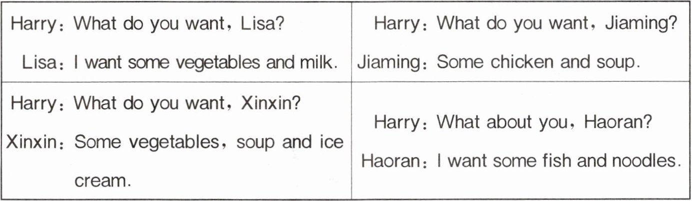 | Xinxin:Some vegetables,soup and ice cream. | Haoran:I want some fish and noodles. |