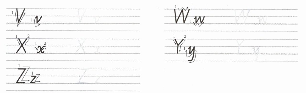 (学生需在练习本上完成对Vv, Ww, Xx, Yy, Zz的认读、描摹和书写)
