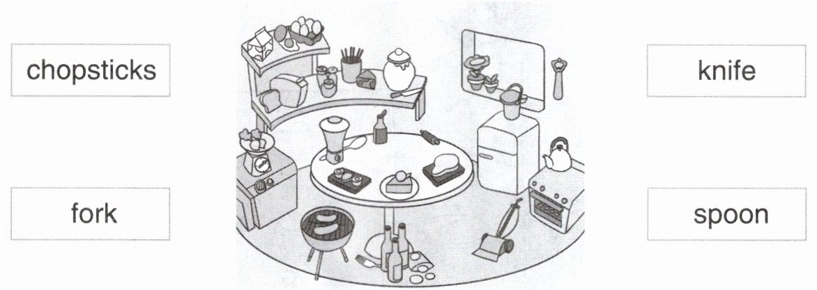 一 考眼力。从厨房中找出下列餐具,连一连。