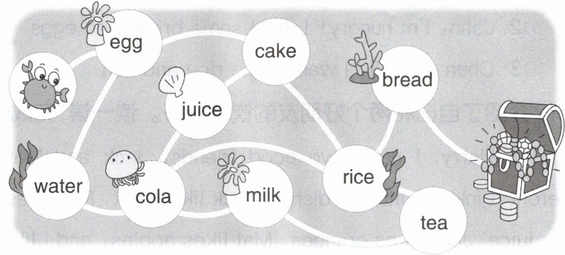 二 小螃蟹只有沿着食物单词走,才能顺利找到宝藏,请你帮它画出路线。