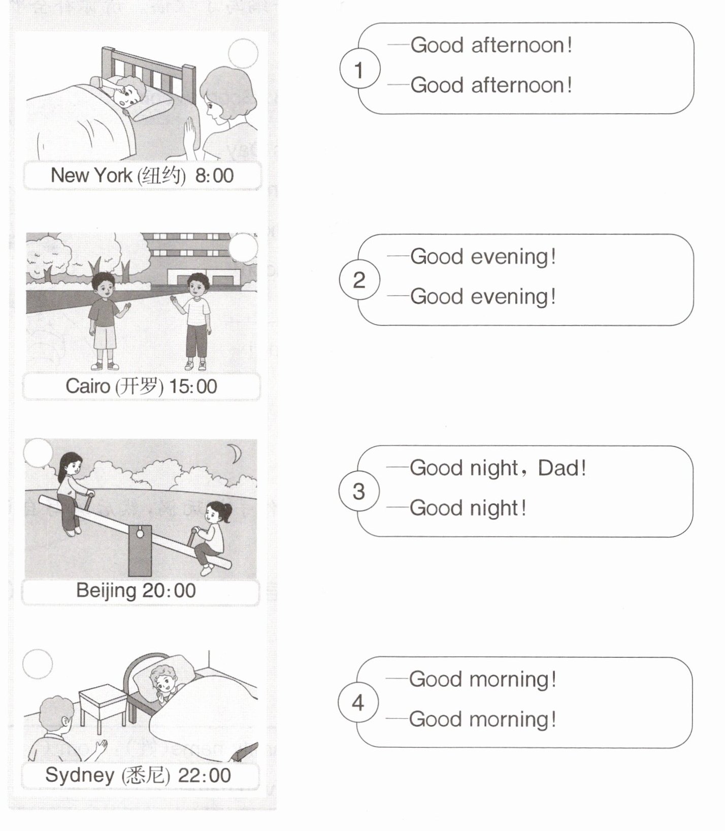 三 北京晚上8点,世界其他地方是什么时间呢?下面是Yaoyao制作的时区科普海报图,请你根据图片选择合适的对话,帮她完成海报。