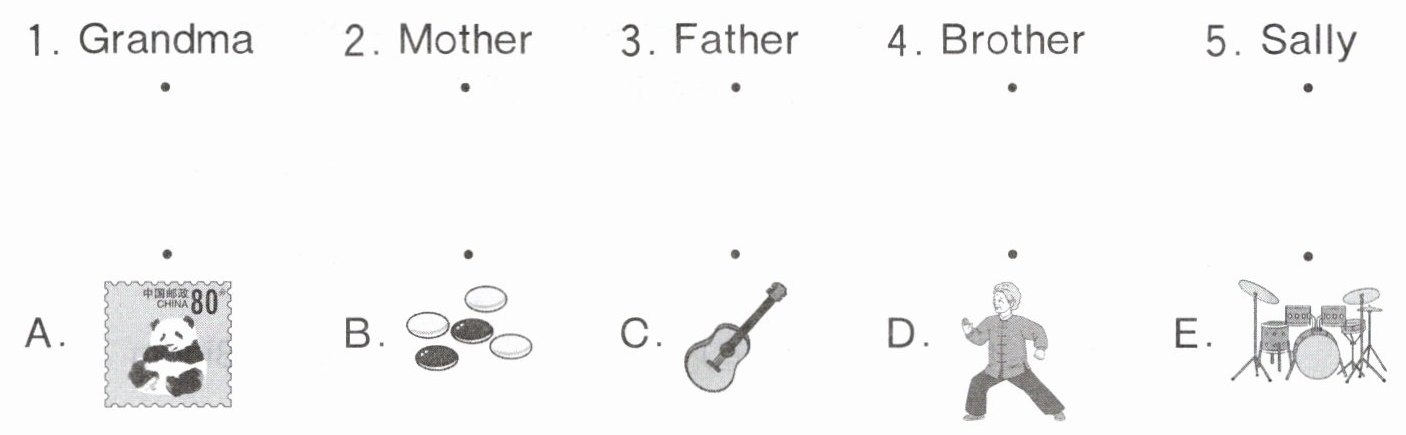 任务一:根据纪念册内容,将Sally及家人与相应的爱好连线。