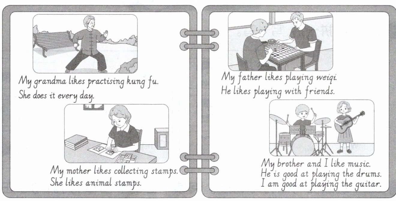 三 阅读Sally制作的家人爱好纪念册,完成任务。