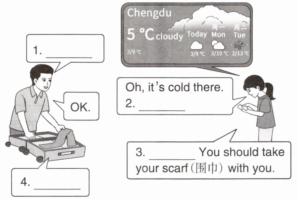Feifei 的爸爸在为出差打包行李。选择合适的句子,补全对话。