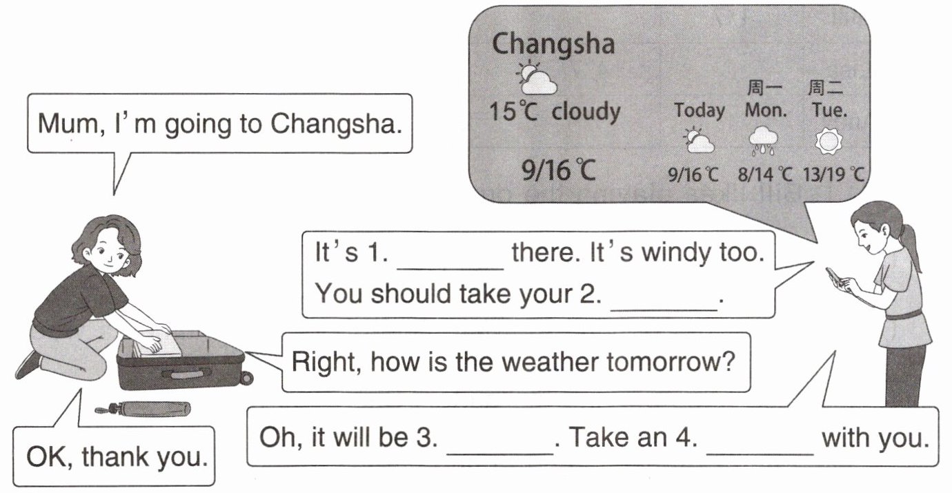 去长沙前,Sally 的妈妈帮她查询天气信息做行前准备。根据天气预报,选择合适的单词,补全对话(有两项多余)。
