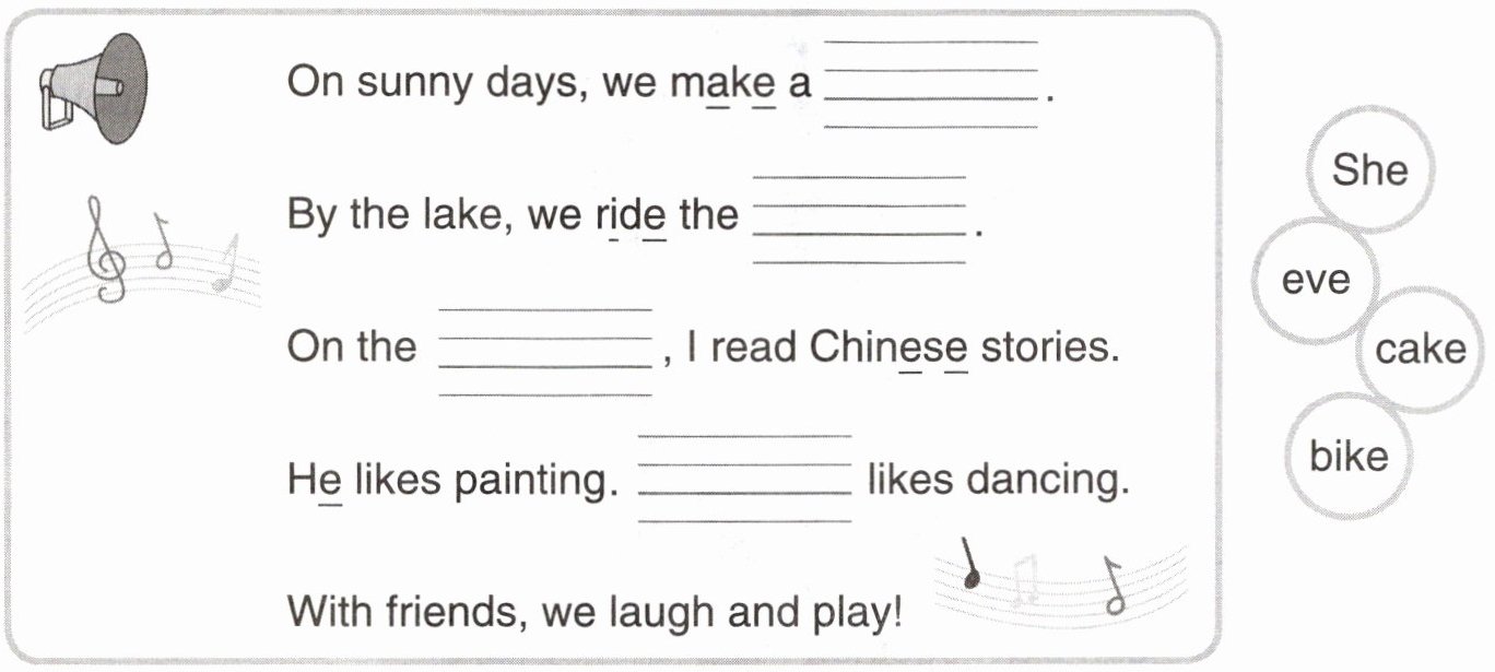 得知将要去研学,Sally 开心地唱起了歌谣。根据每句画线部分的发音,选择合适的单词,补全歌谣。