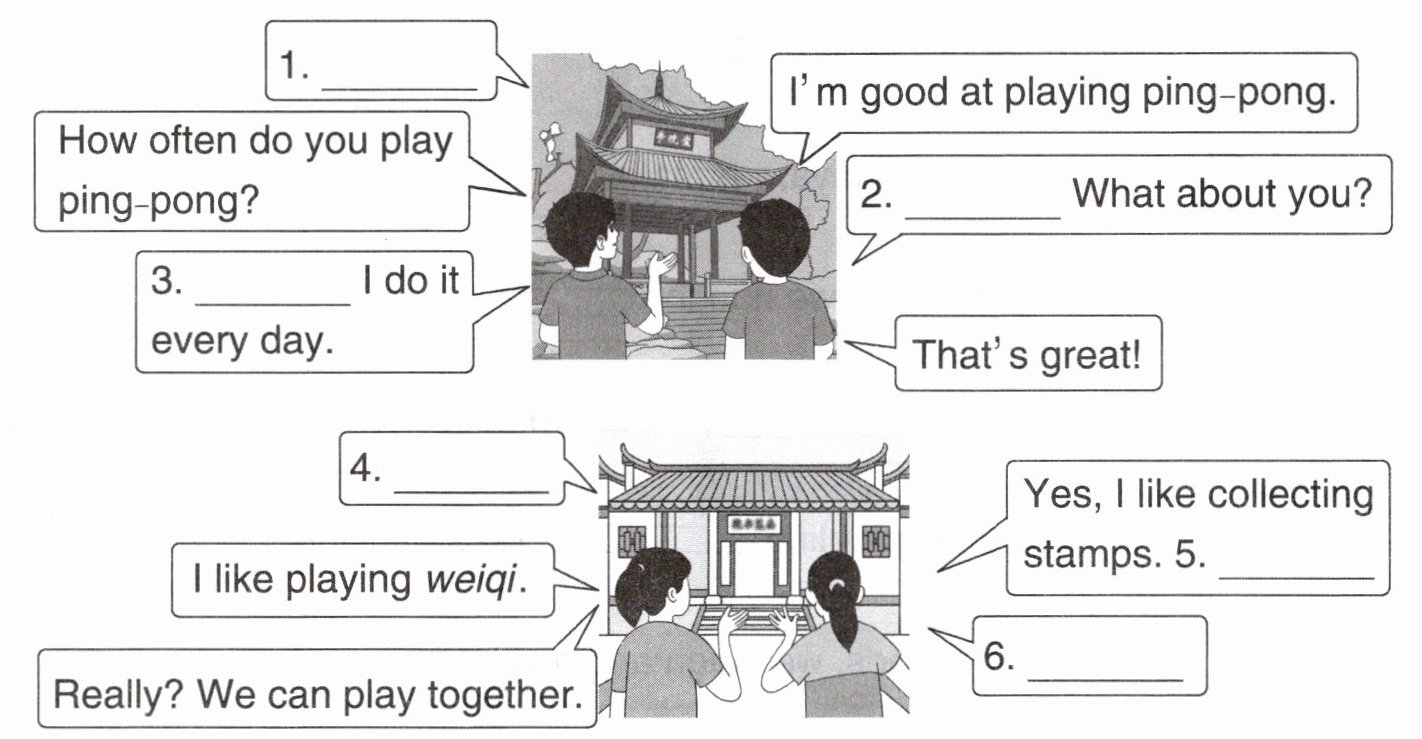 同学们在研学期间交流起各自的爱好。选择合适的句子,补全对话。