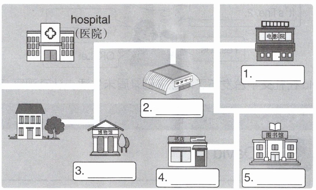 幸福社区准备张贴社区建筑示意图。观察图片,选一选,补全示意图。