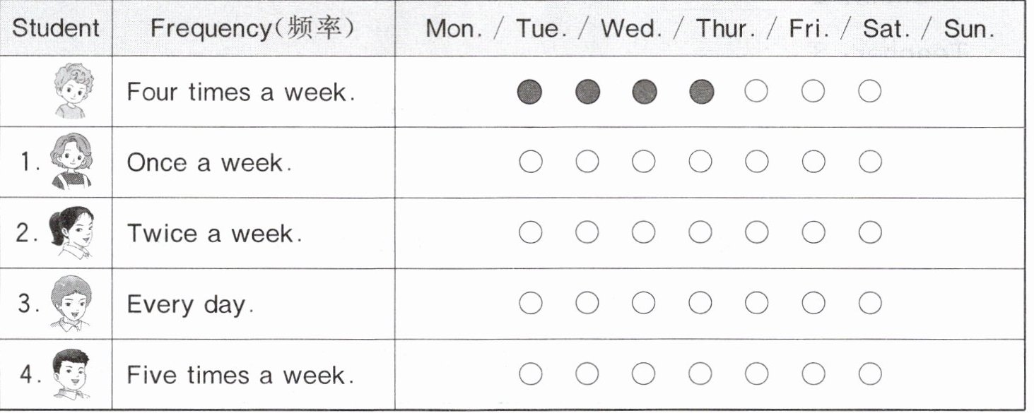 1. □ Swimming. □ Running. □ Jumping rope.□√ Playing ping - pong. □ Playing basketball. □ Playing football.Playing ping-pong.2. □ Once a week. □√ Twice a week. □ Three times a week.□ Four times a week. □ Five times a week. □ Six times a week.□ Every day.(画图:两个简单的太阳图案)