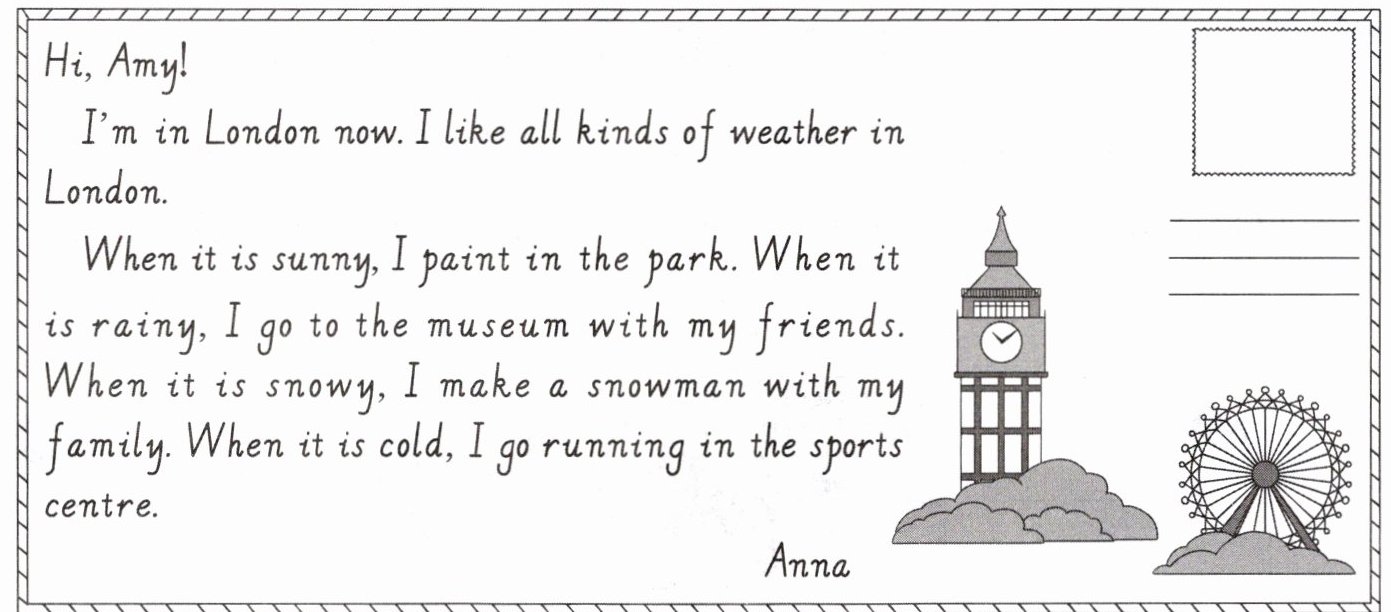 三 在伦敦旅行的 Anna 要给 Amy 寄明信片。请你阅读明信片,完成任务。
