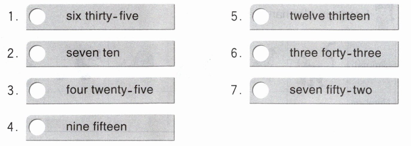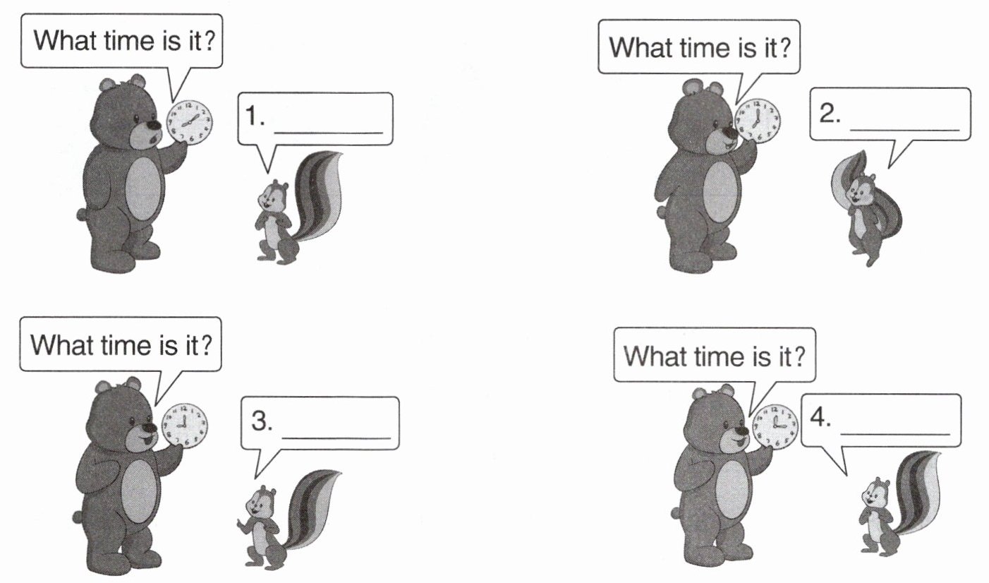 松鼠 Zip 和大熊 Zoom 在玩认时间的游戏。看图,选择合适的句子,填一填。