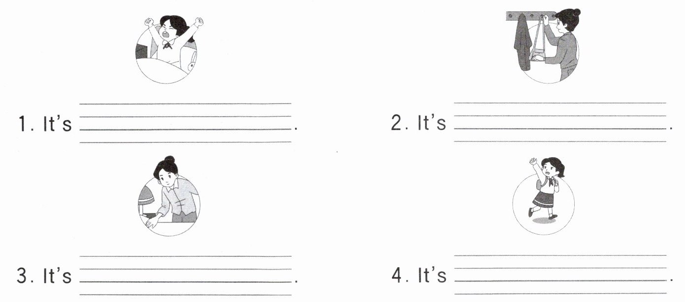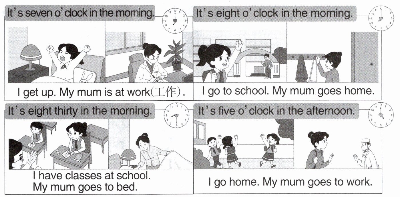 1. seven o'clock 2. eight o'clock 3. eight thirty 4. five o'clock