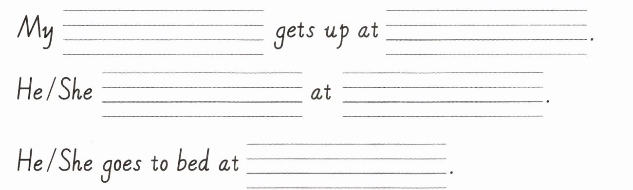 My father gets up at six o'clock in the morning. He goes to work at eight o'clock in the morning. He goes to bed at ten o'clock in the evening.