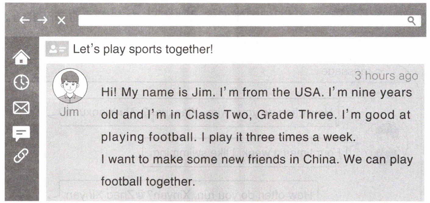 三 Jim 发帖子寻找运动伙伴。读一读,完成任务。