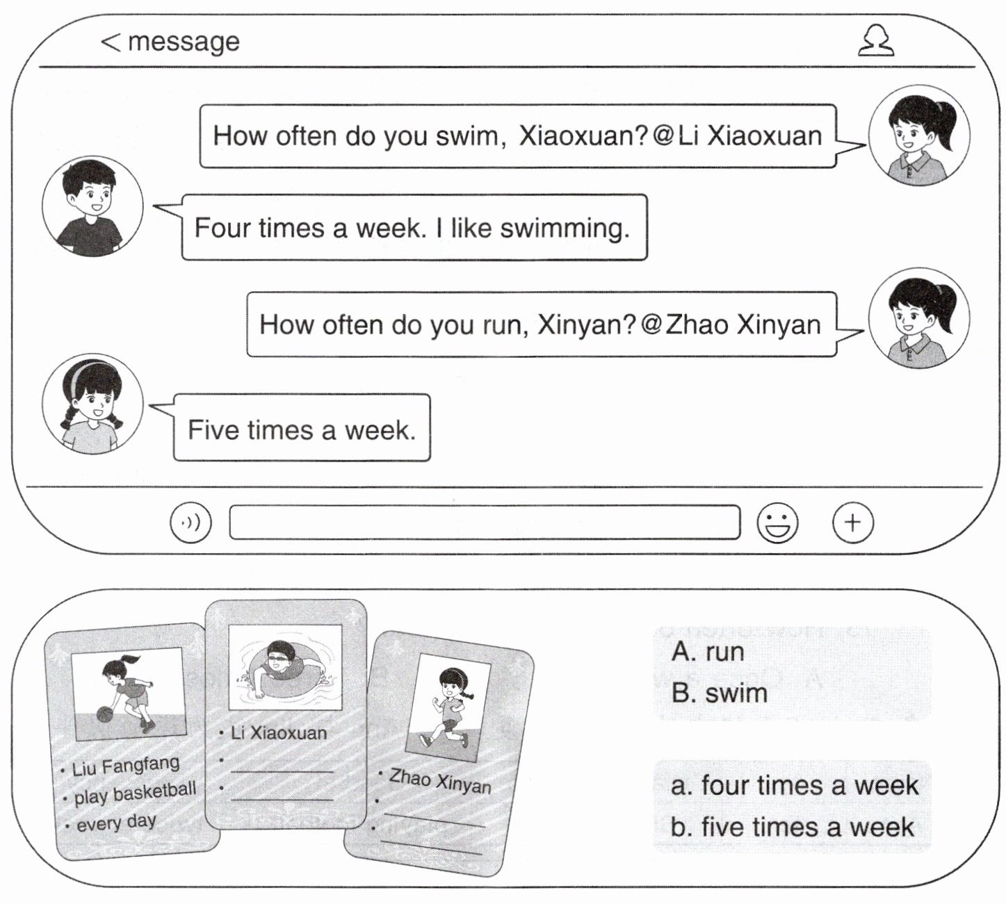 一 Fangfang 正在线上询问同学们的运动情况,为制作运动书做准备。读一读,选一选,帮她完成运动书。