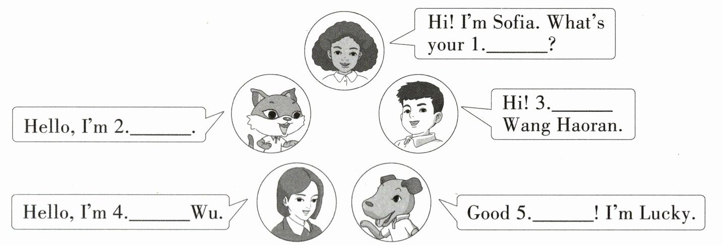 Ⅸ Look,read and choose. 新学期,我们认识了下面几位新朋友。选词填空,补全对话,将序号写在横线上。(10分)