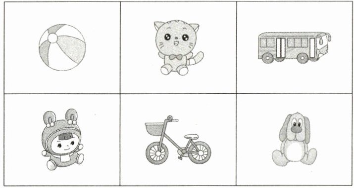 提示:圈出toy dog, toy bus, toy bike, doll, toy cat和ball。