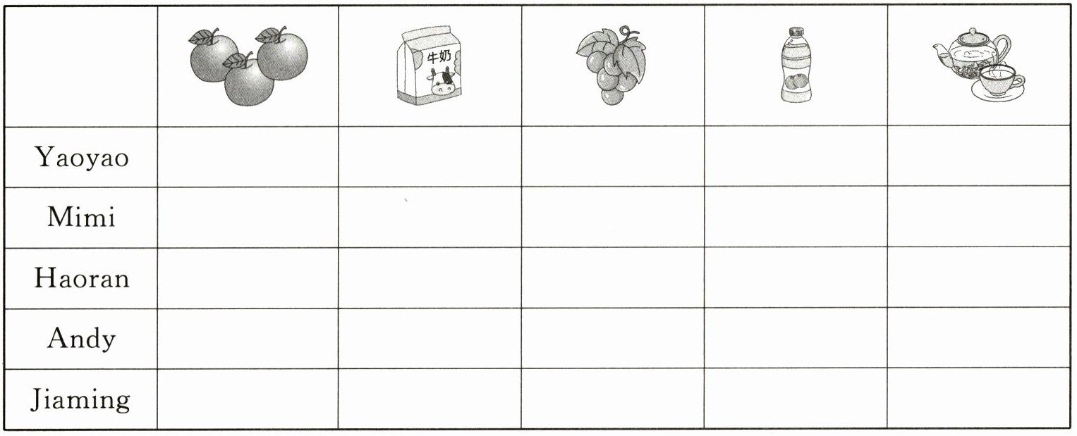 III Listen and tick. Xinxin在调查朋友们喜欢的食物或饮品。听对话,在表格的正确位置画“√”。(对话读两遍)(10分)