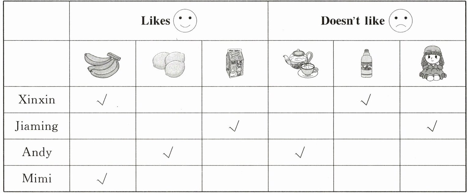 XI Look, read and judge. Xiaoli对同学们喜欢和不喜欢的东西做了一个调查。根据调查表,判断句子正(T)误(F)。(10分)