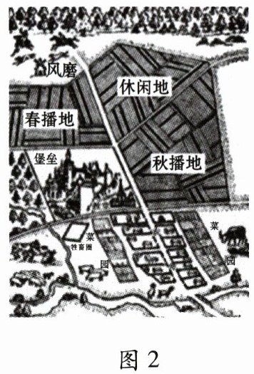 (2) 图 2 所反映的西欧庄园是何时开始逐渐流行起来的? 结合所学知识,从庄园居民和庄园土地构成,说明西欧庄园的特点是什么。(15 分)