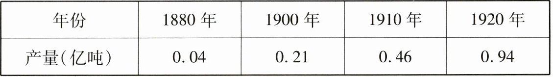 7. 下表反映了 1880—1920 年世界石油年产量的变化。对这一变化的出现产生了直接影响的是