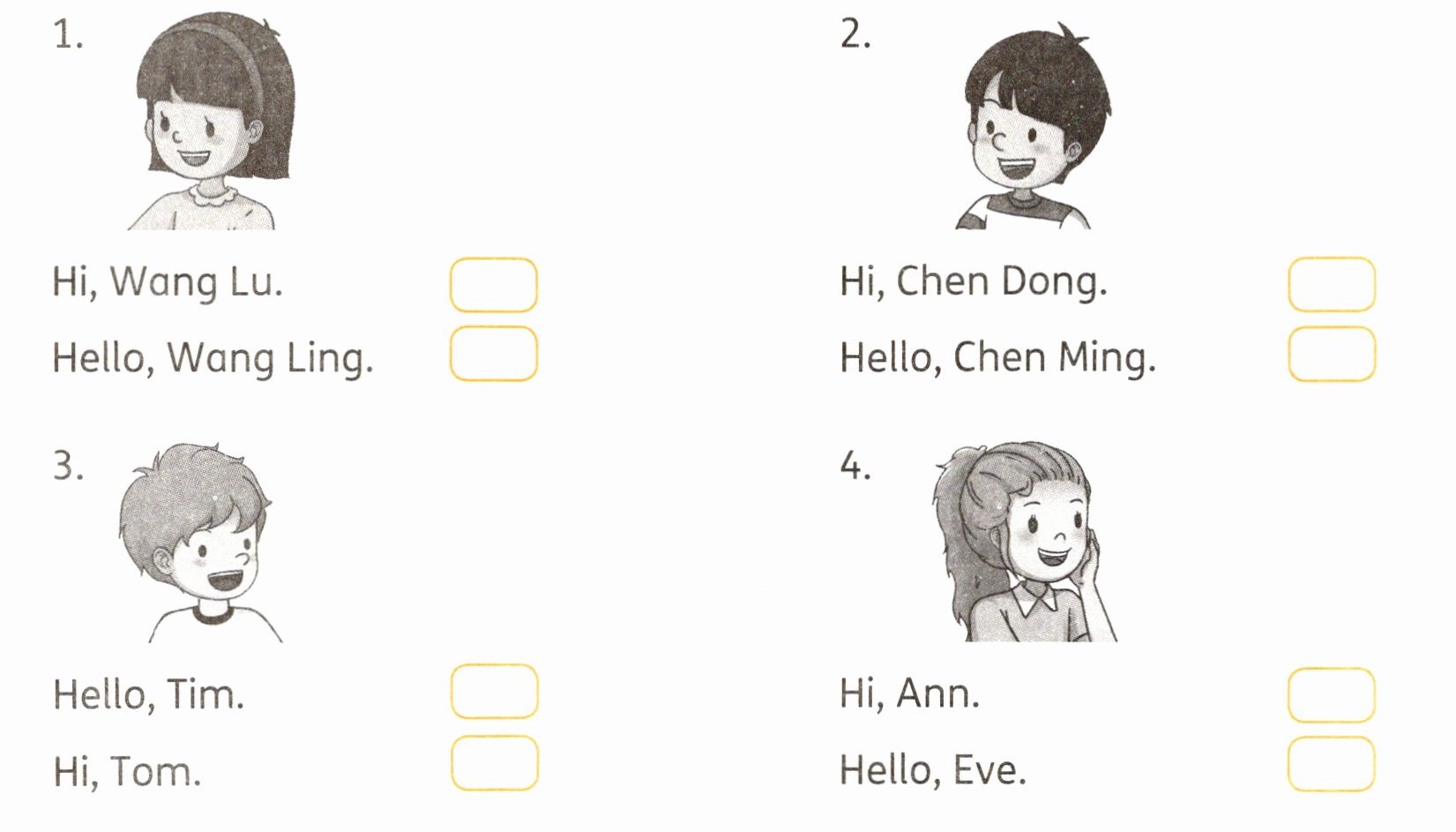 1. Hi, Wang Lu. 2. Hi, Chen Dong. 3. Hi, Tom. 4. Hello, Eve.