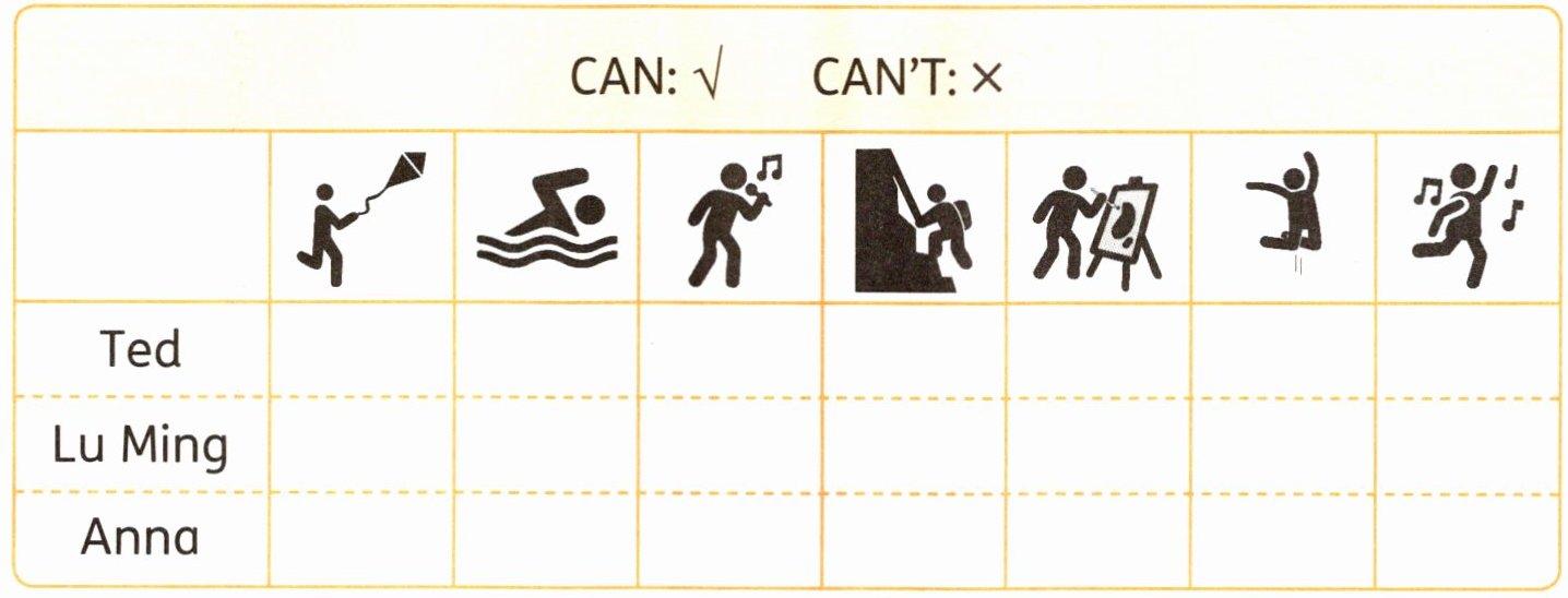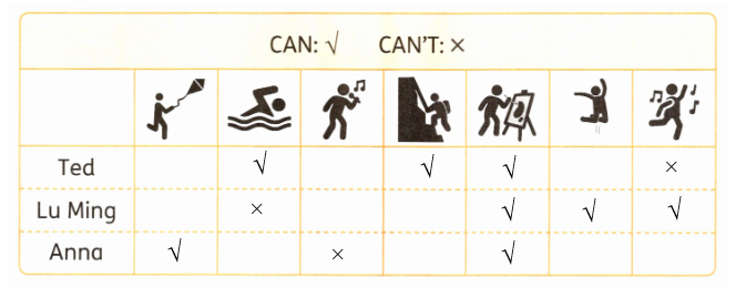 Ted can climb, swim and draw. He can't sing. Lu Ming can dance, jump and draw. But he can't swim. What about Anna? She can fly a kite and draw. She can't sing. They are great! Thank you.