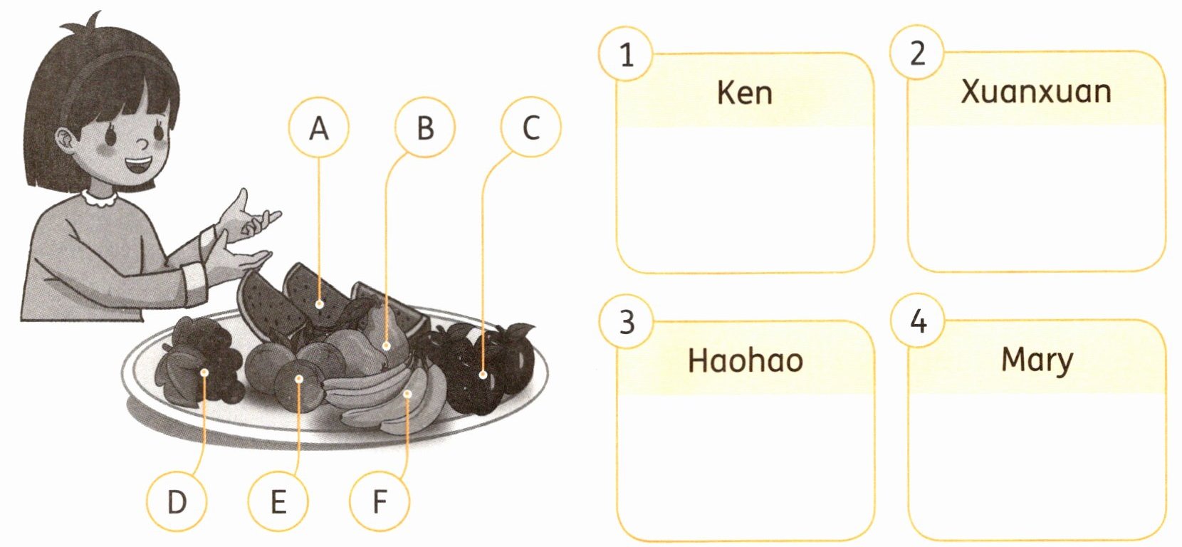 一、Listen, look and choose. Wang Lu 正在用什么水果招待她的朋友们? 听一听,看图片,把水果的字母序号写在对应的方框中。
