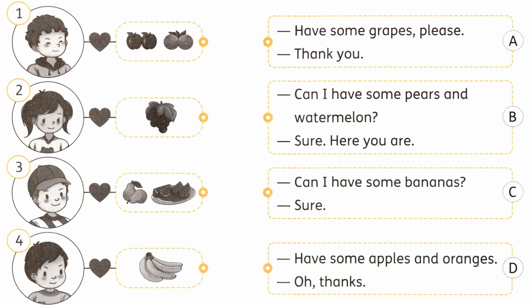 二、Look, read and match. 同学们正在分享水果。看图片,读一读,把相符的句子和图片连起来吧!
