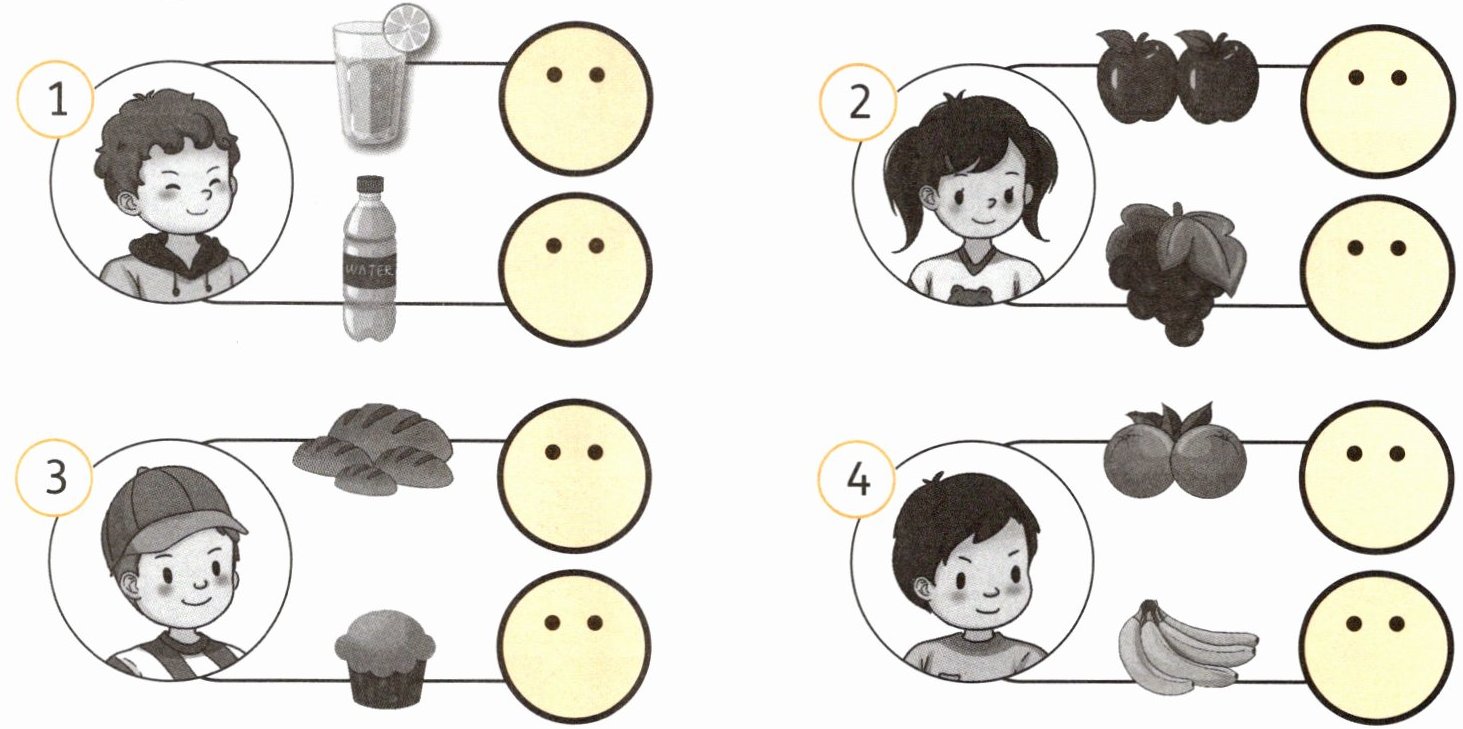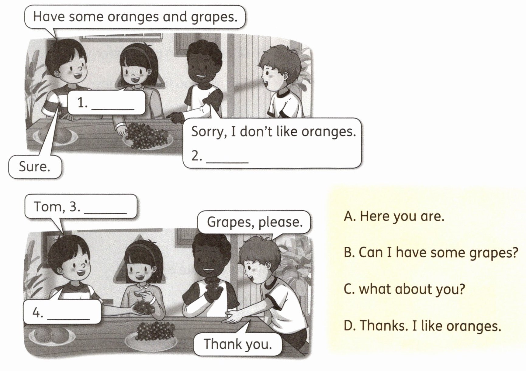 二、Look, read and choose. Chen Dong 准备了很多水果招待同学们。看图片,读一读,选择正确的句子补全对话。