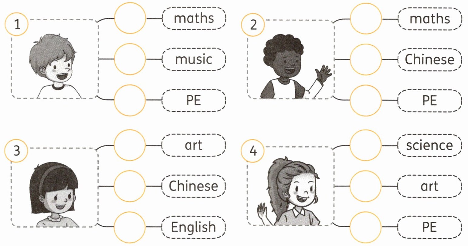 一、Listen and tick. 同学们喜欢的学科各不相同。听一听,选择正确的选项,在对应的圆圈内打“√”。