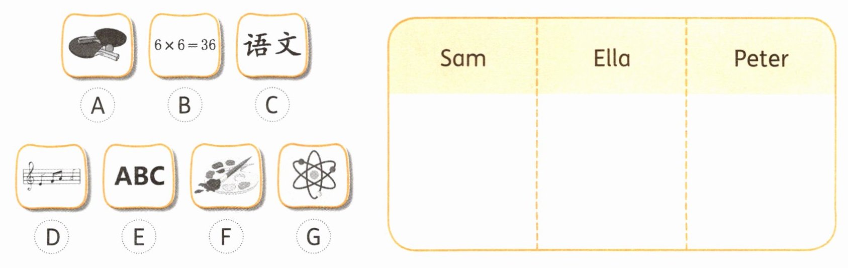 二、Read and choose. Sam 正在与同学们讨论各自喜欢的学科。读一读,将学科的字母序号写在对应的名字的方框中。