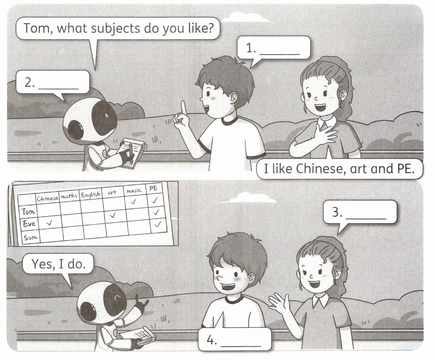 三、Look, read and choose. Sam 正在调查同学们喜欢的学科。看图片,读一读,选择正确的句子补全对话。