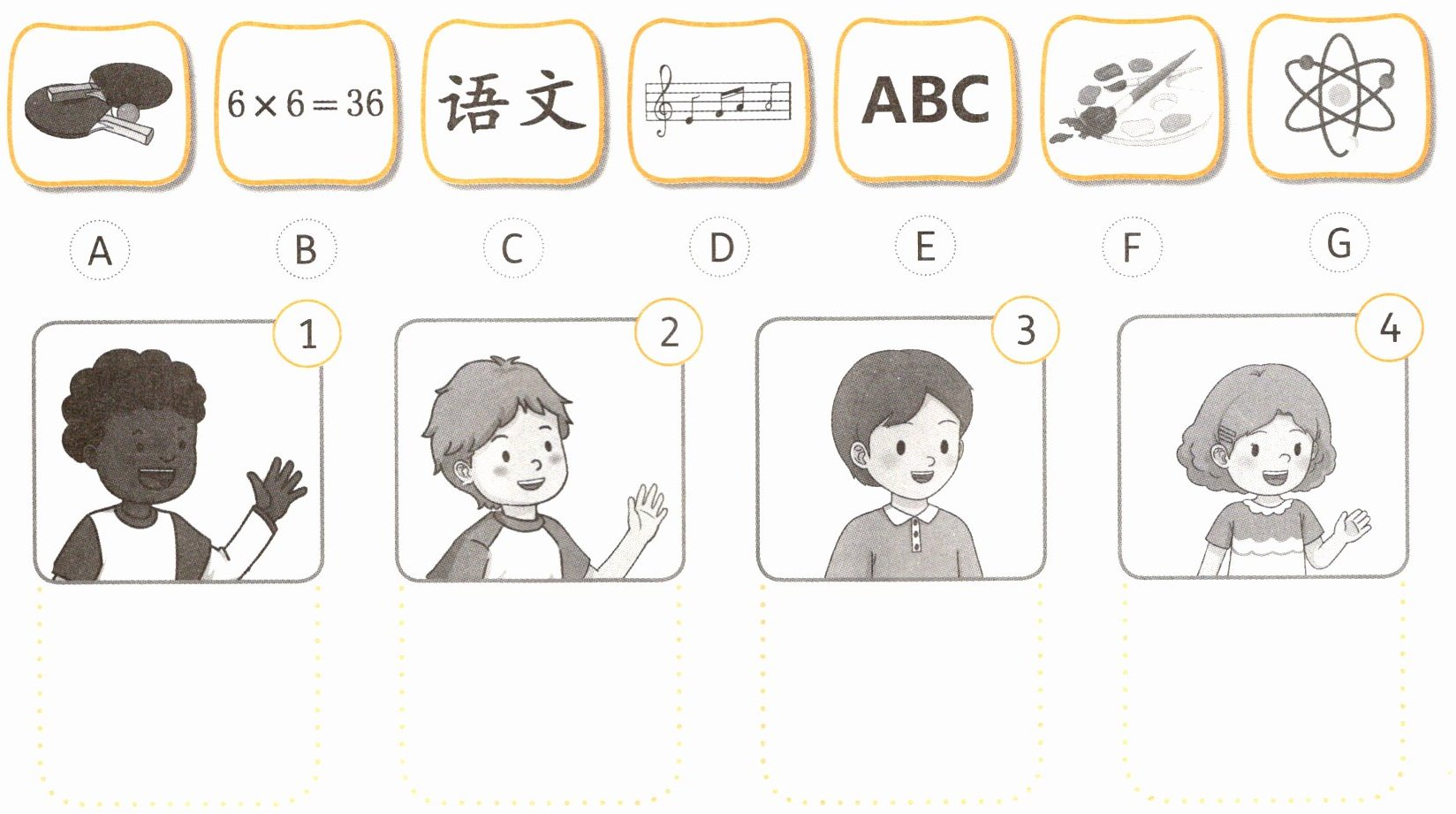 一、Listen and choose. 同学们今天都有什么课程呢?听一听,将学科的字母序号写在对应的人物的方框内。