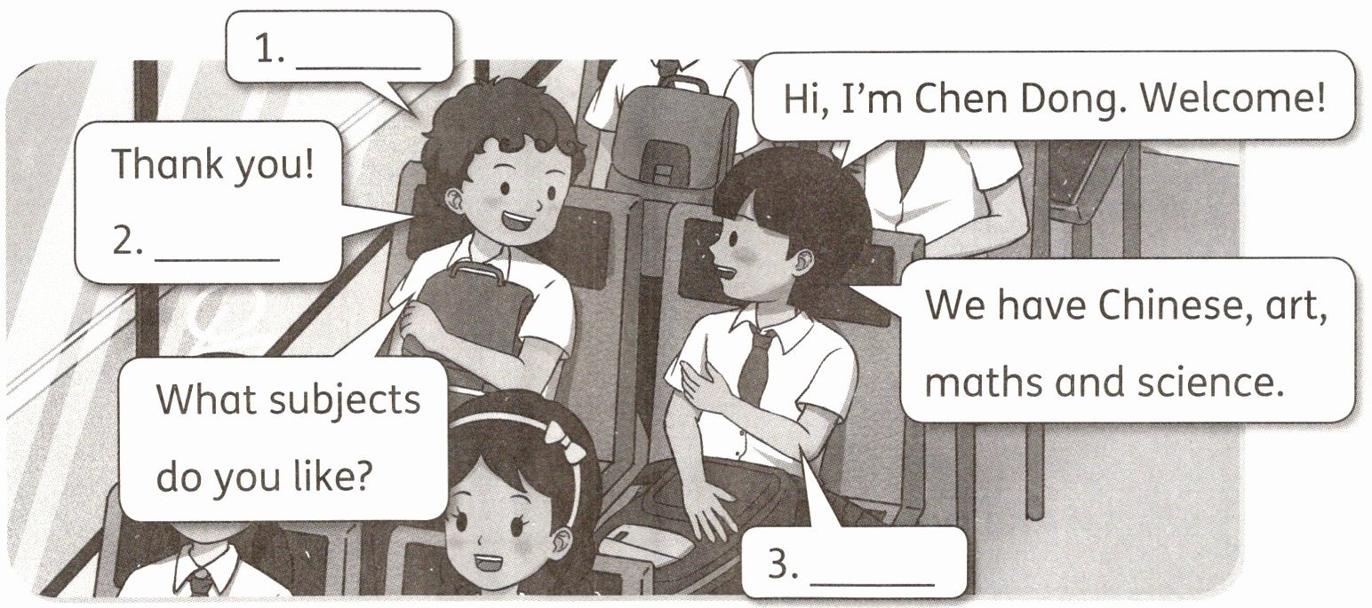 二、Look, read and choose. 公交车上,Chen Dong 正在与新同学聊天。看图片,读一读,选择正确的句子补全对话。
