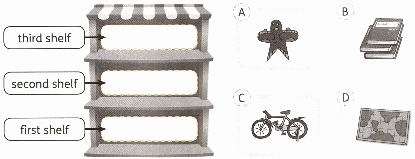 一、Listen and choose. Eve 正在整理她的储物柜。听一听,将物品的字母序号写在对应的柜层里。