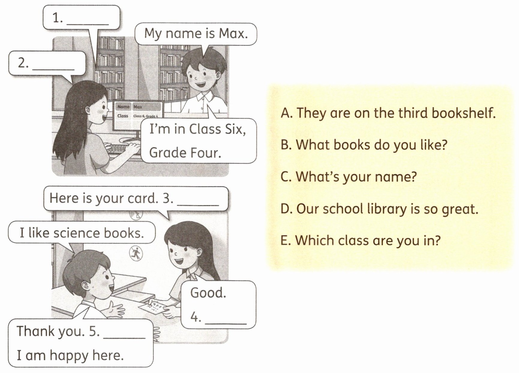 二、Look, read and choose. Max 正在图书馆借书。看图片,读一读,选择正确的句子补全对话。