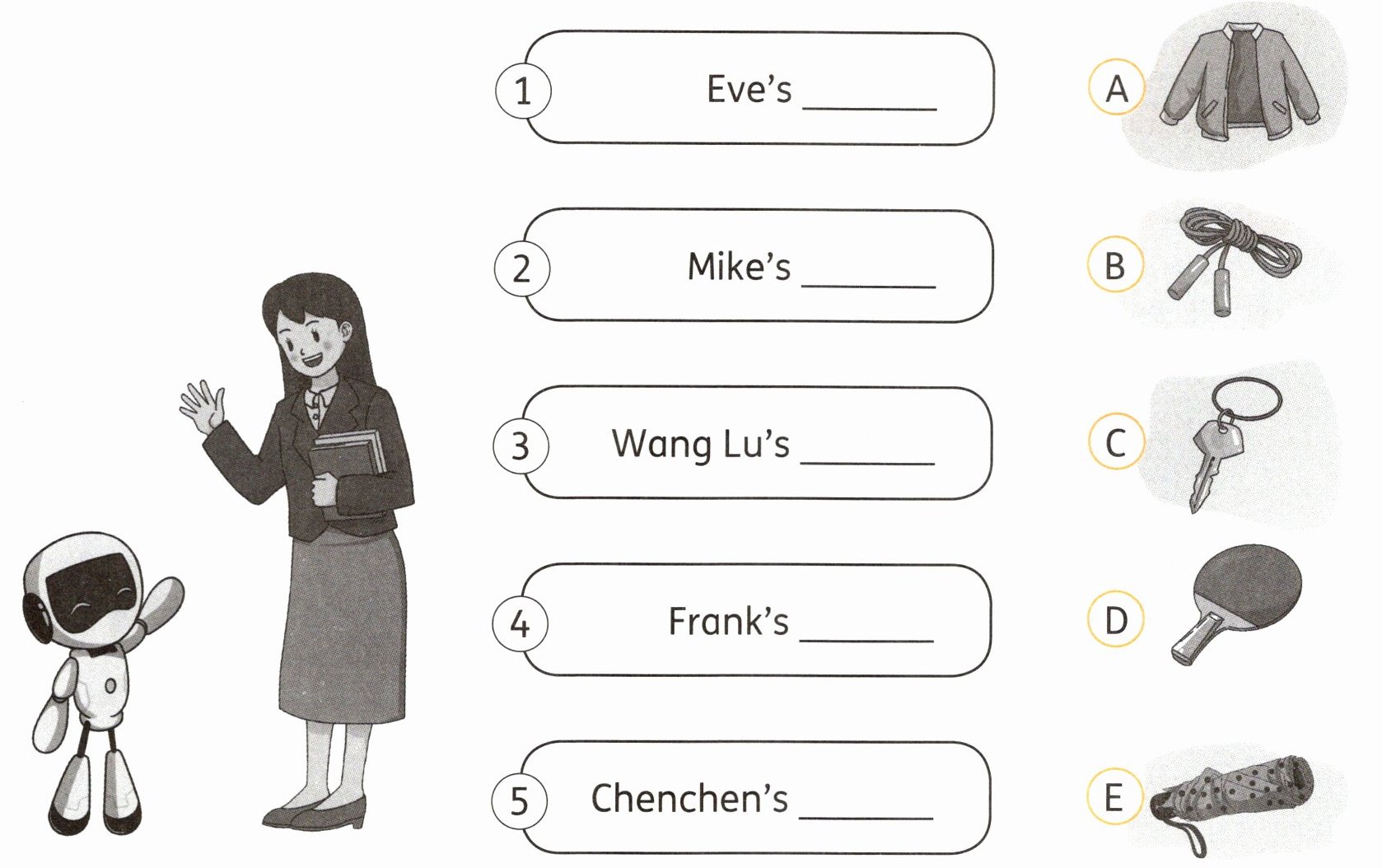一、Listen and choose. Miss Li 与 Sam 在讨论桌上那些物品的主人是谁。听一听,选择正确的物品,将字母序号写在对应的横线上。