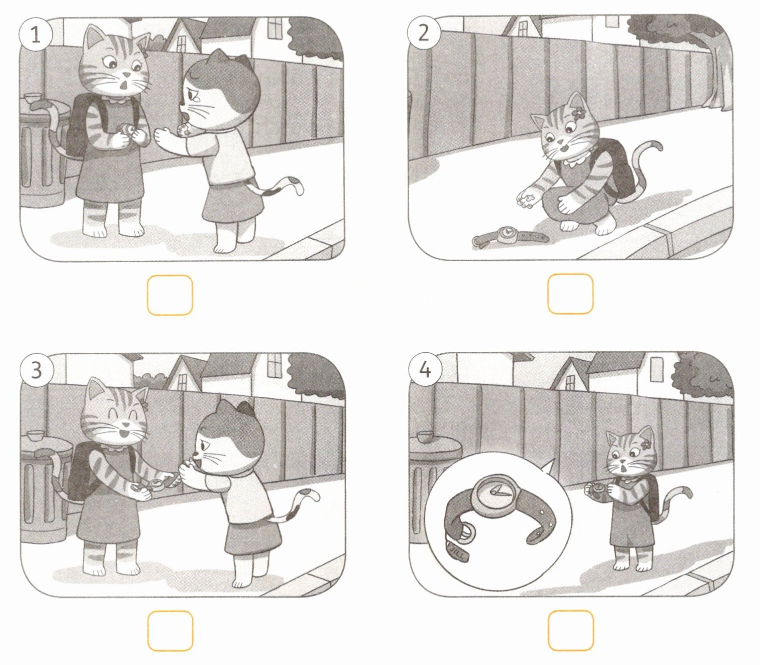 二、Listen and write √ or ×. 小猫捡到了一只手表,是谁丢失的呢?听一听,判断所听内容与图片是(√)否(×)相符。