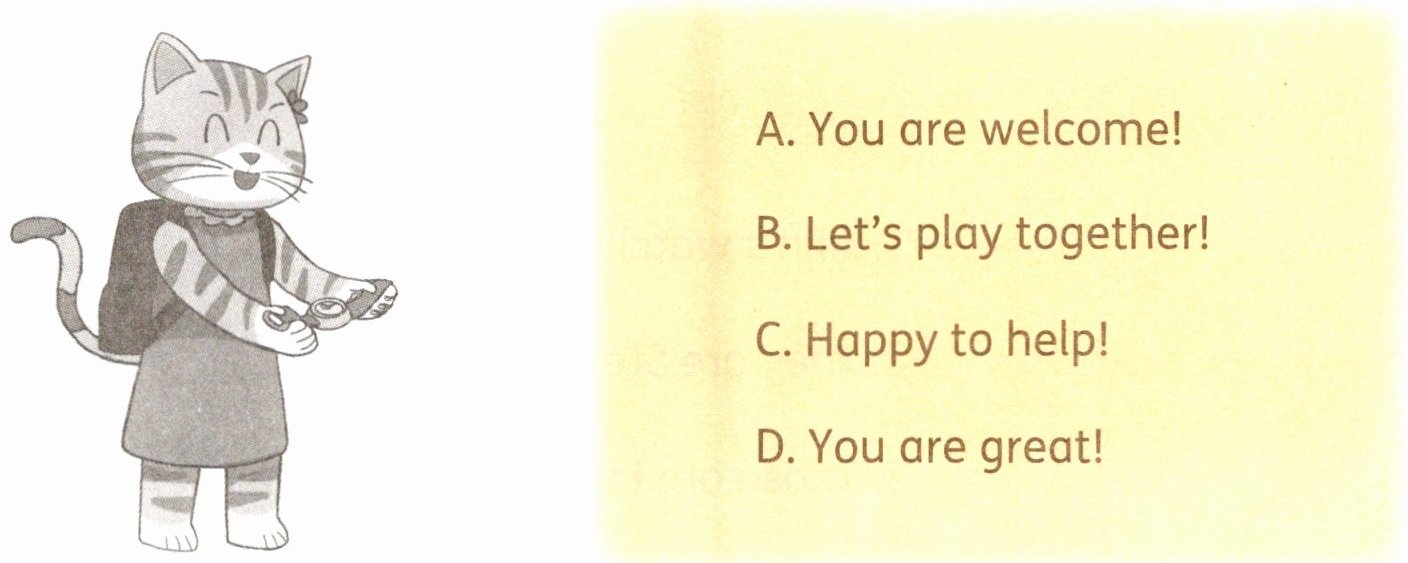 三、Think and tick. 小猫拾金不昧的精神值得我们学习,你想要对它说些什么呢?想一想,给相应句子的字母序号打“√”。