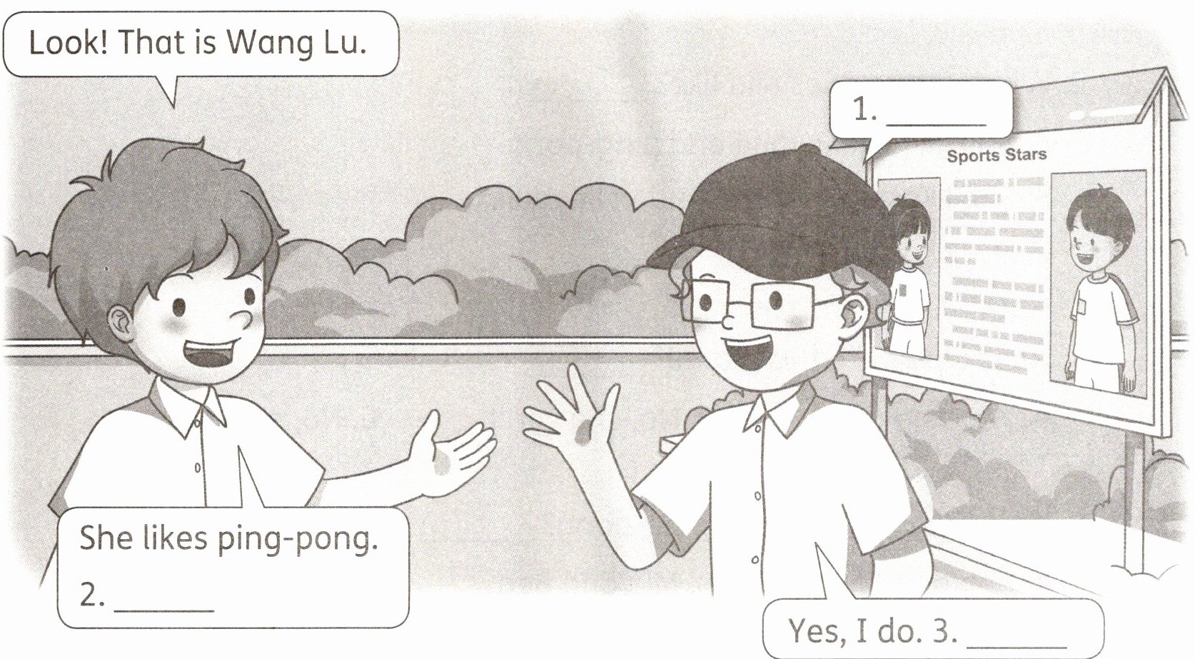 二、Look, read and choose. 看到本周的运动之星,Tom 与 David 在说些什么?看图片,读一读,选择正确的句子补全对话。