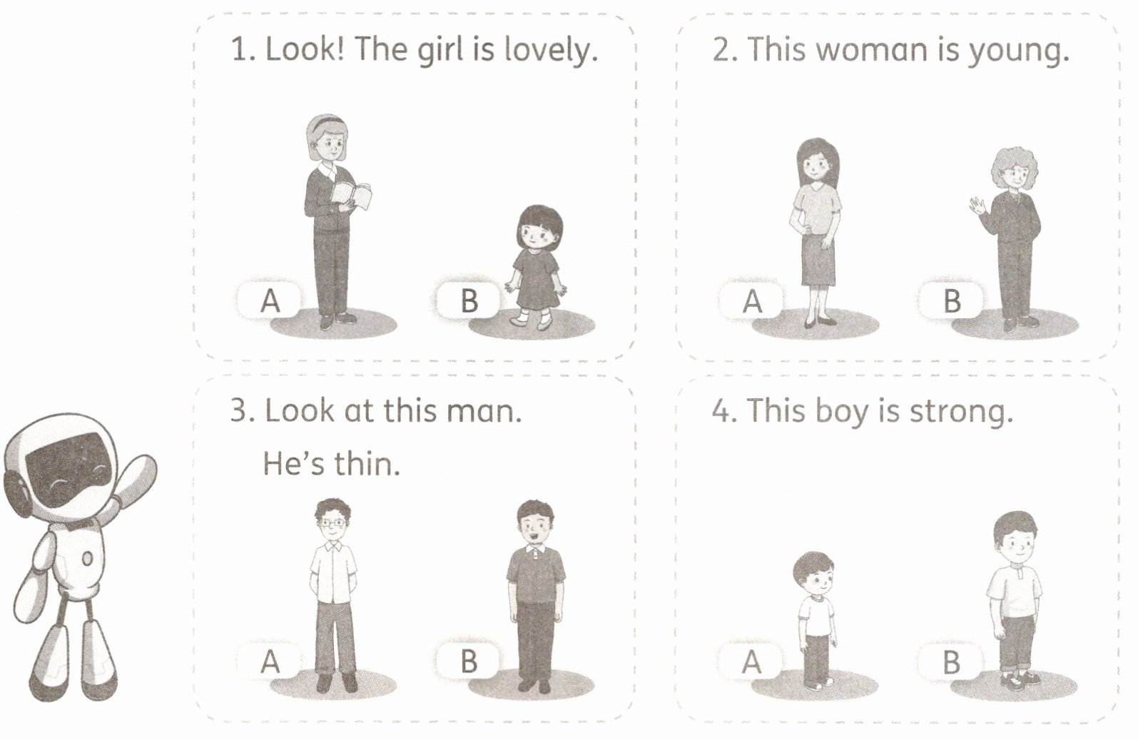二、Read and circle. Sam 正在练习看图说话。读一读,圈出 Sam 正在描述的人物。
