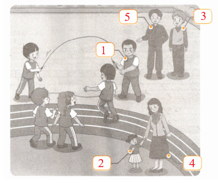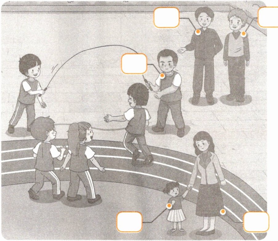 一、Listen and number. 听一听,根据所听内容为图片中的人物排序,并将数字序号写在人物对应的方框内。