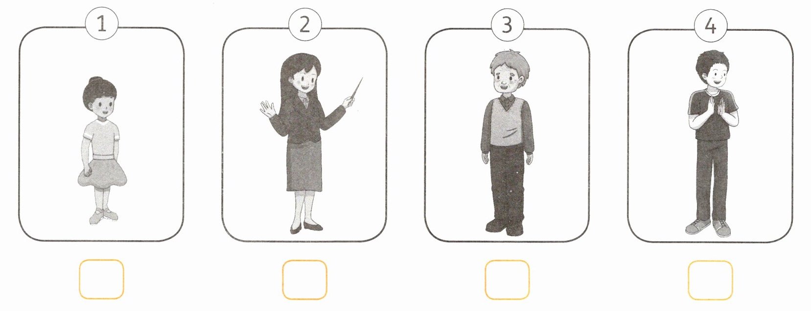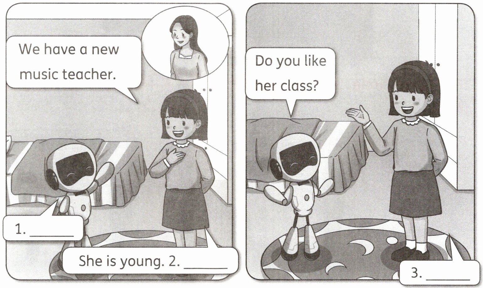 二、Look, read and choose. 学校来了一位新老师。看图片,读一读,选择正确的句子补全对话。
