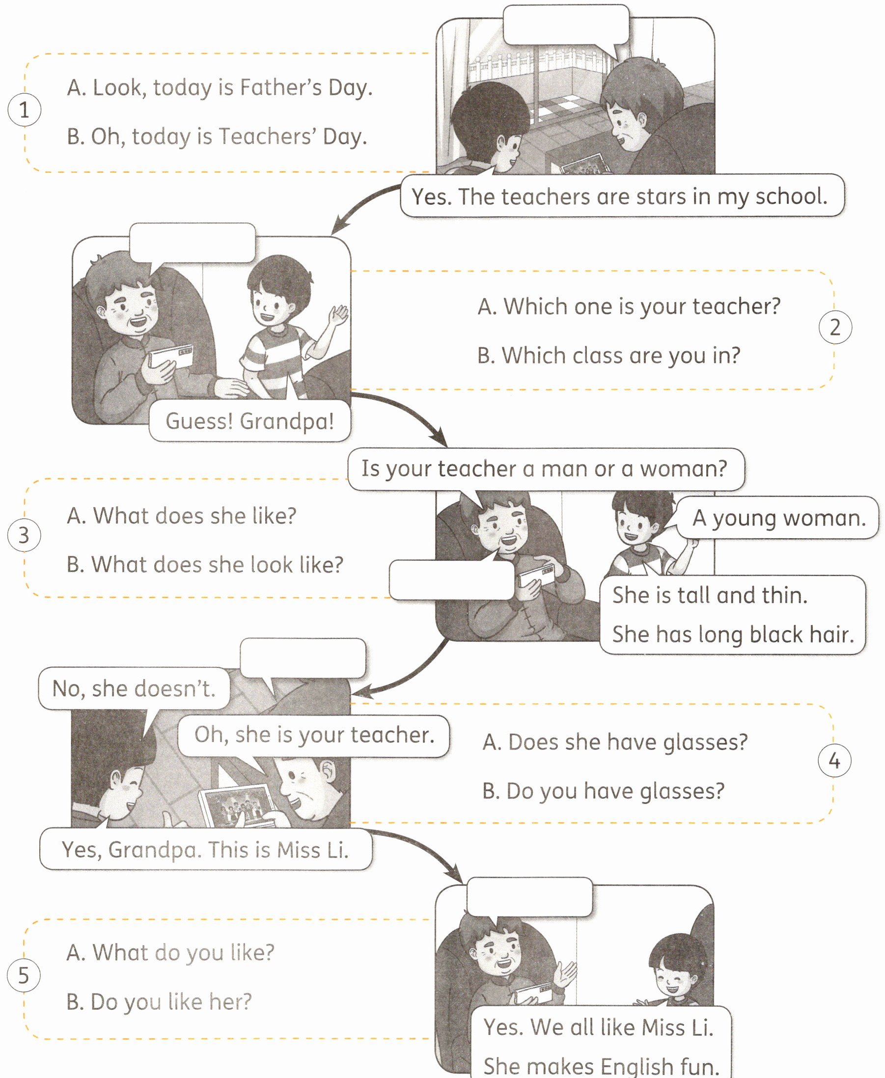 二、Look, read and choose. Chen Dong 与爷爷正在翻看学校教师节庆祝活动的照片。看图片,读一读,根据故事发展,选择正确的句子补全对话。
