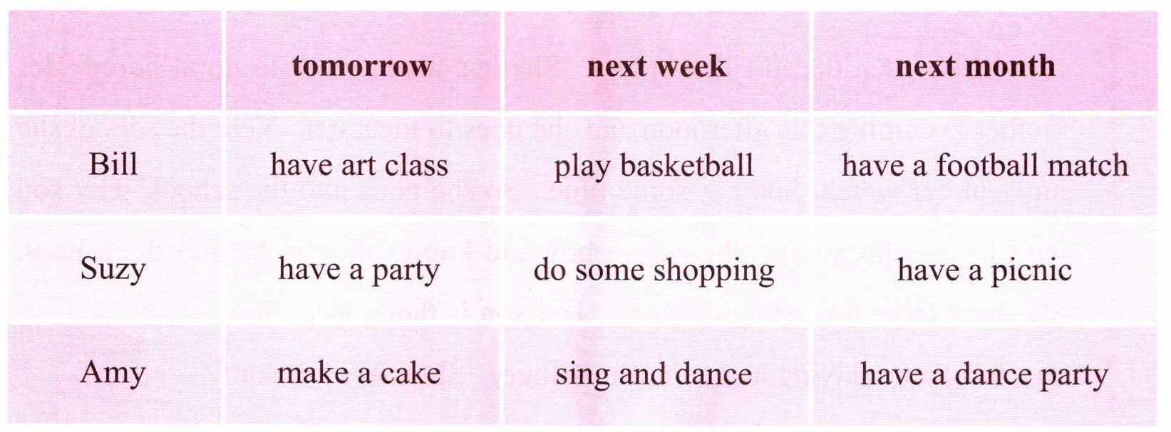 1. She is going to have a party tomorrow. 2. No, she won't. 3. He will have a football match next month. 4. Yes, she will. 5. What is Amy going to do tomorrow? 6. What will Bill do next week?