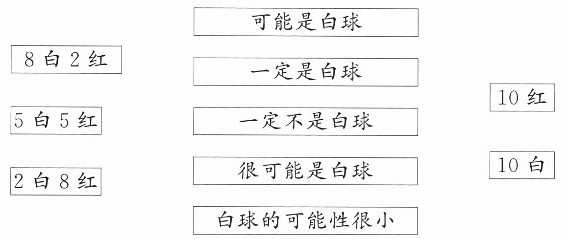 4. 从下面的五个箱子里分别摸出一个球,结果是哪个?连一连。(10分)
