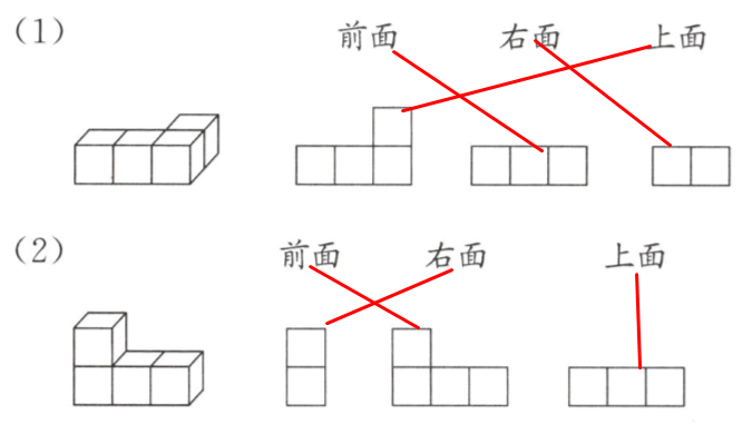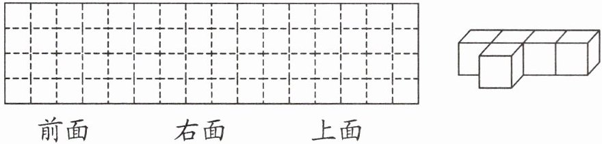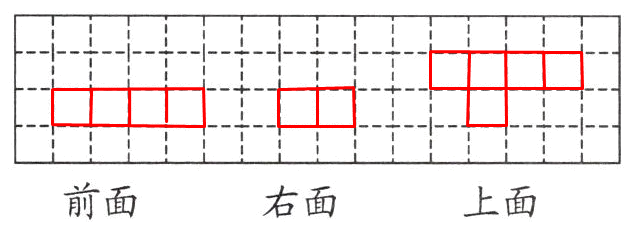 2. 用5个同样大的正方体摆一摆。再从前面、右面和上面看一看,在方格纸上画出看到的图形。(6分)